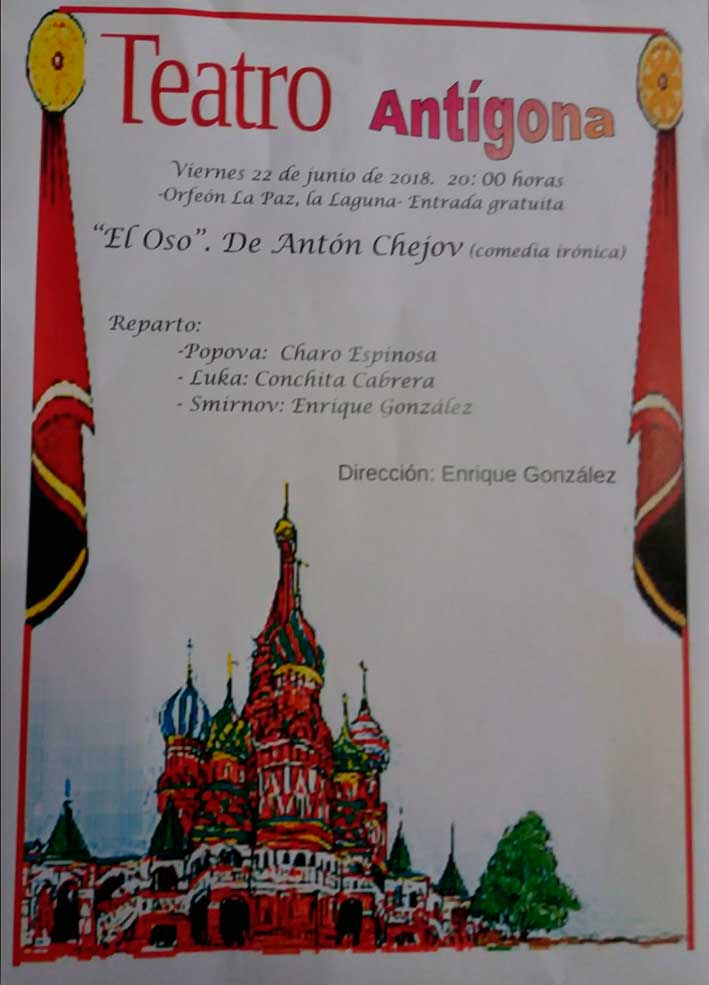 El viernes día 22 de junio a partir de las 20 horas, la Asociación Cultural Antígona ofrece en el Teatro del Orfeón La Paz la obra «El Oso», de Antón Chejov, con la dirección de Enrique González. El acto tendrá entrada libre, ¡Te esperamos!