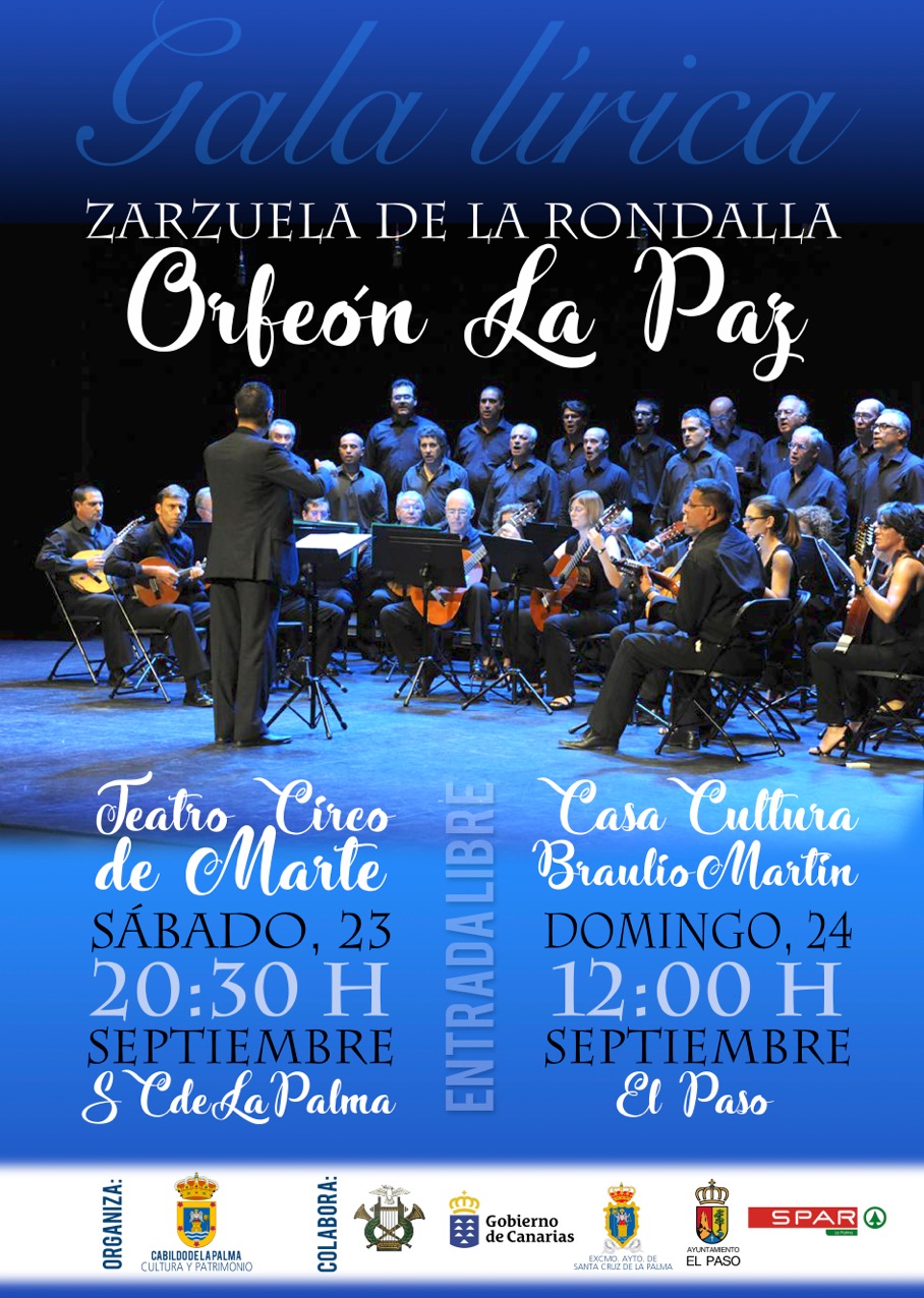 La Consejería de Cultura del Cabildo de La Palma llevará a la Isla al Orfeón La Paz. El Teatro Circo de Marte (Santa Cruz de La Palma) y la Casa de la Cultura Braulio Martín Hernández (El Paso) acogerán los días 23 y 24 de septiembre, respectivamente, las actuaciones de esta formación, que llevará a estos escenarios un completo programa de zarzuela. En la capital la actuación será a las 20:30 horas y en El Paso a las 12:00 horas. En ambos casos el acceso es libre y gratuito para el público asistente hasta completar aforo.